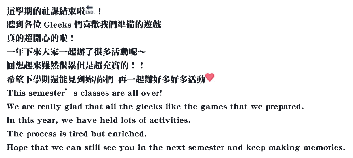 另外,時常演唱英語歌曲也能提升英語實力,除了邁向國際以外,邊唱邊跳邊學外文也是本社一大目的。